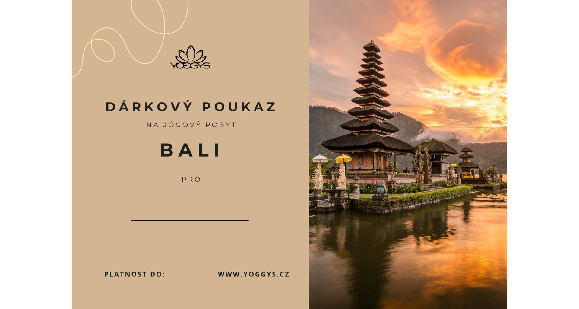Voucher je platný na jakýkoliv pobyt s jógou na Bali, které se konají v roce 2026.