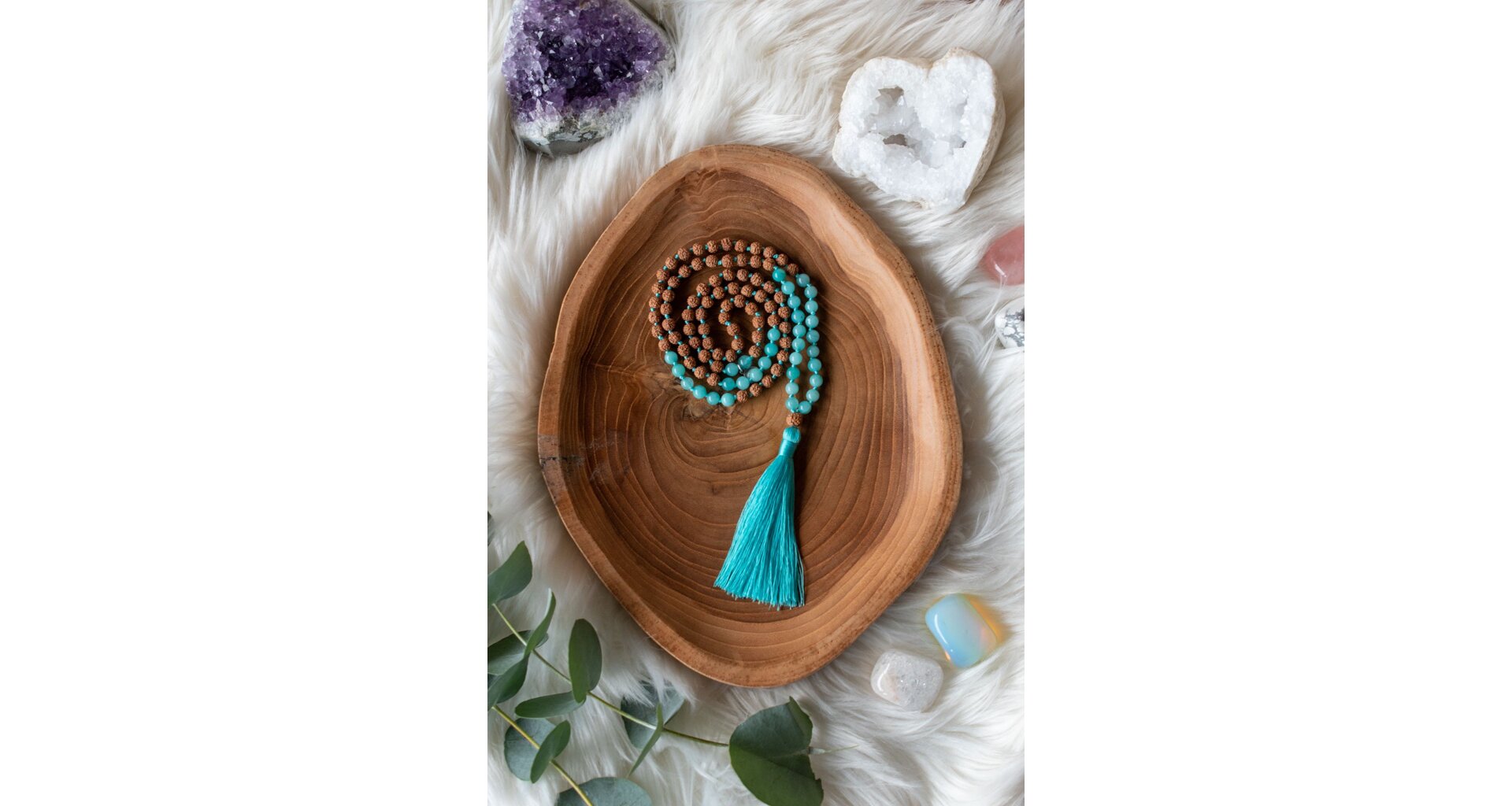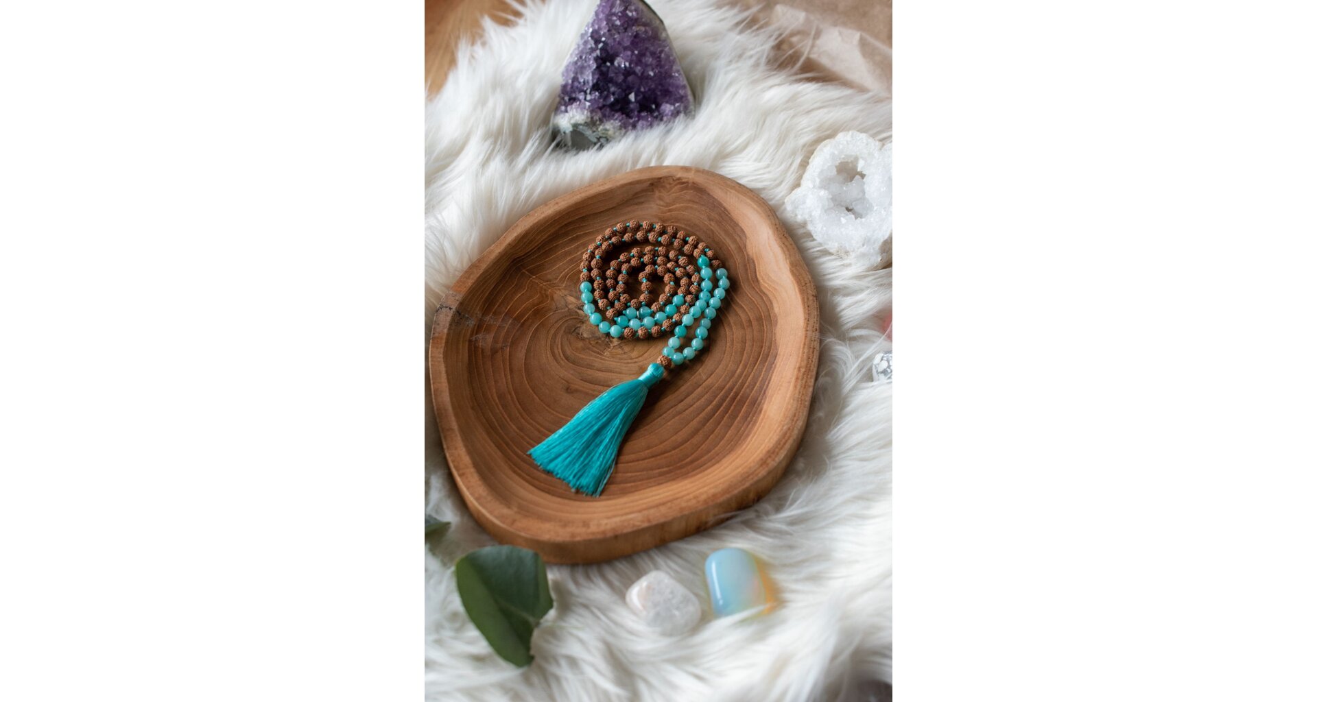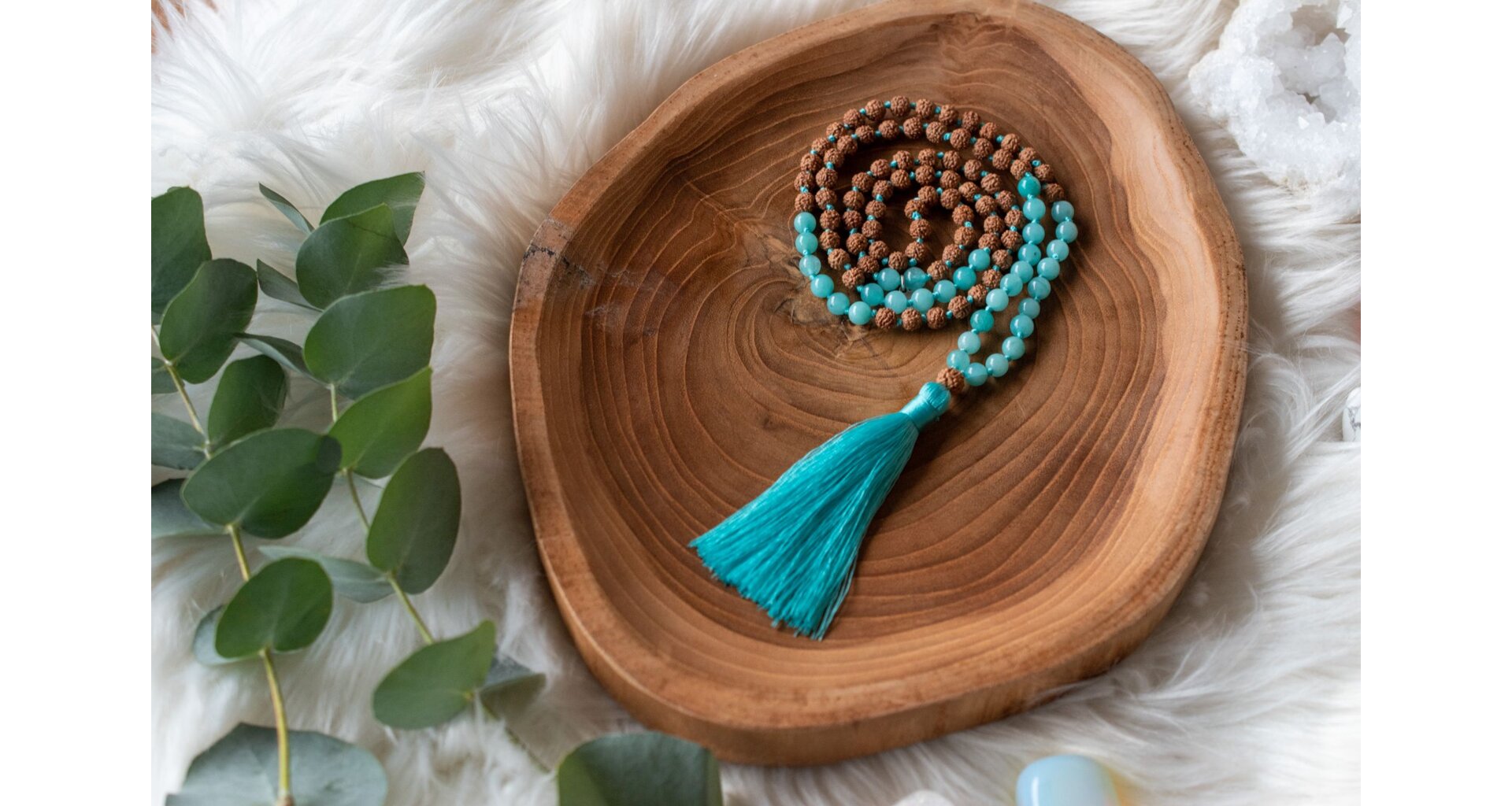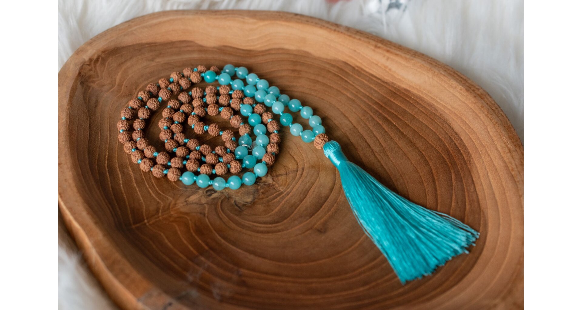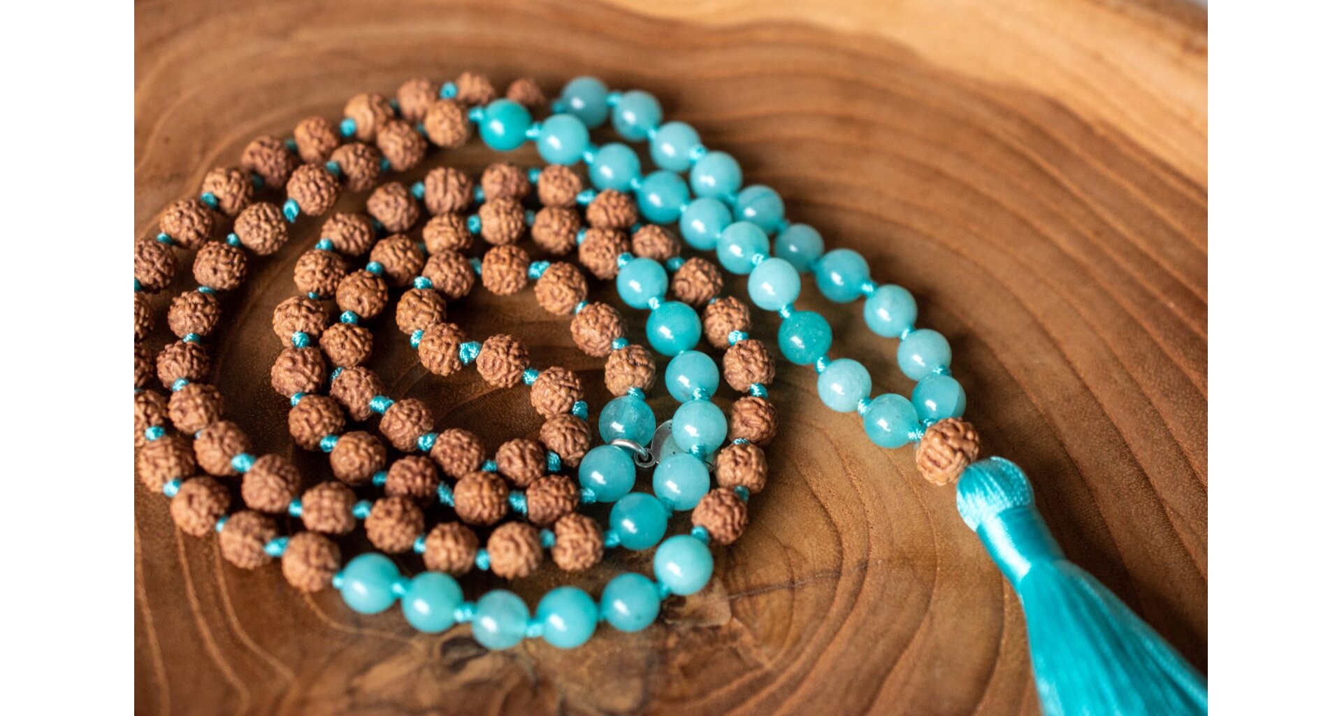 - Ručně vyrobená meditační mala s akvamarínem a rudrakshou