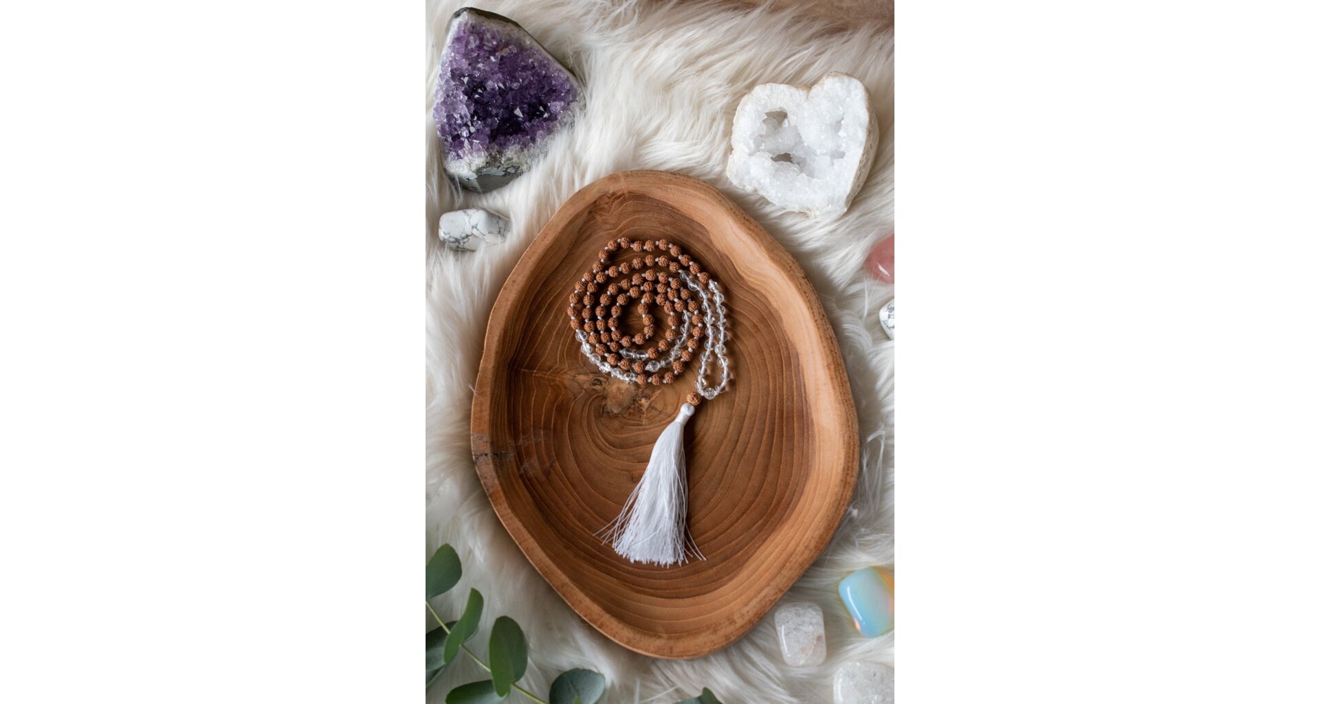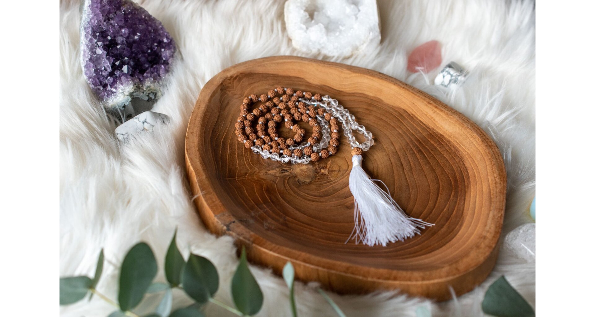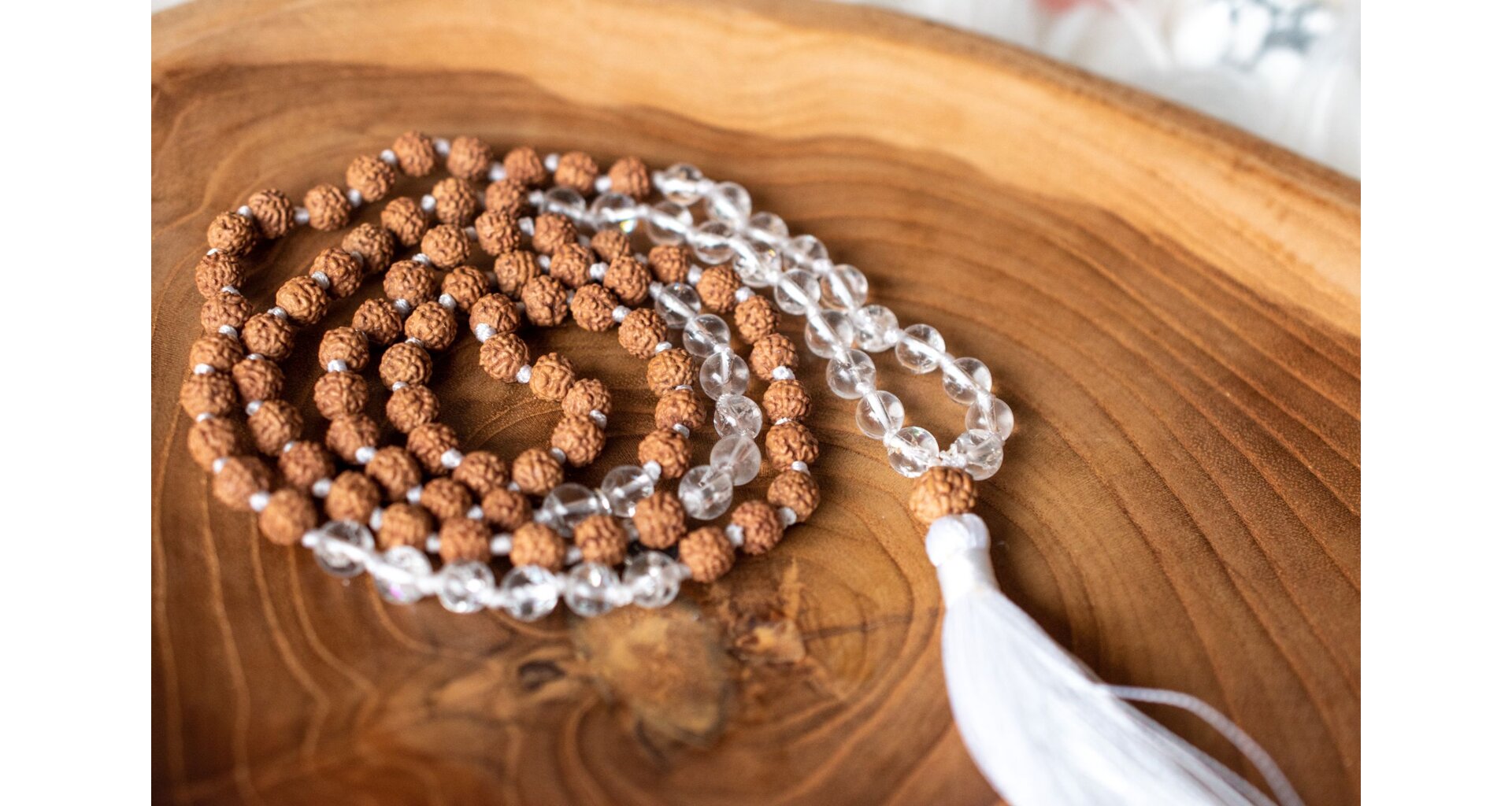 Křišťál a Rudraksha tvoří silnou kombinaci pro očistu, ochranu a duchovní posílení. Křišťál čistí a zesiluje energii, přináší jasnost a podporuje vnitřní růst. Rudraksha, posvátné semínko, přináší ochranu, klid a duchovní sílu. Společně pomáhají harmonizovat tělo i mysl a podporují hlubokou meditaci.