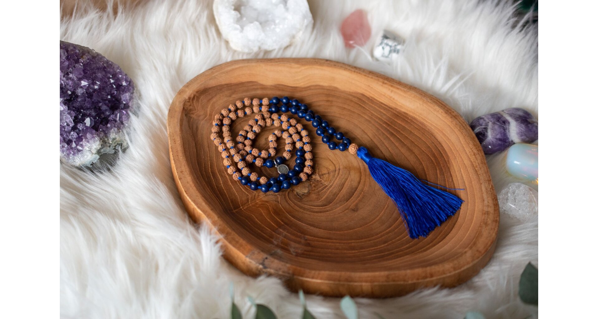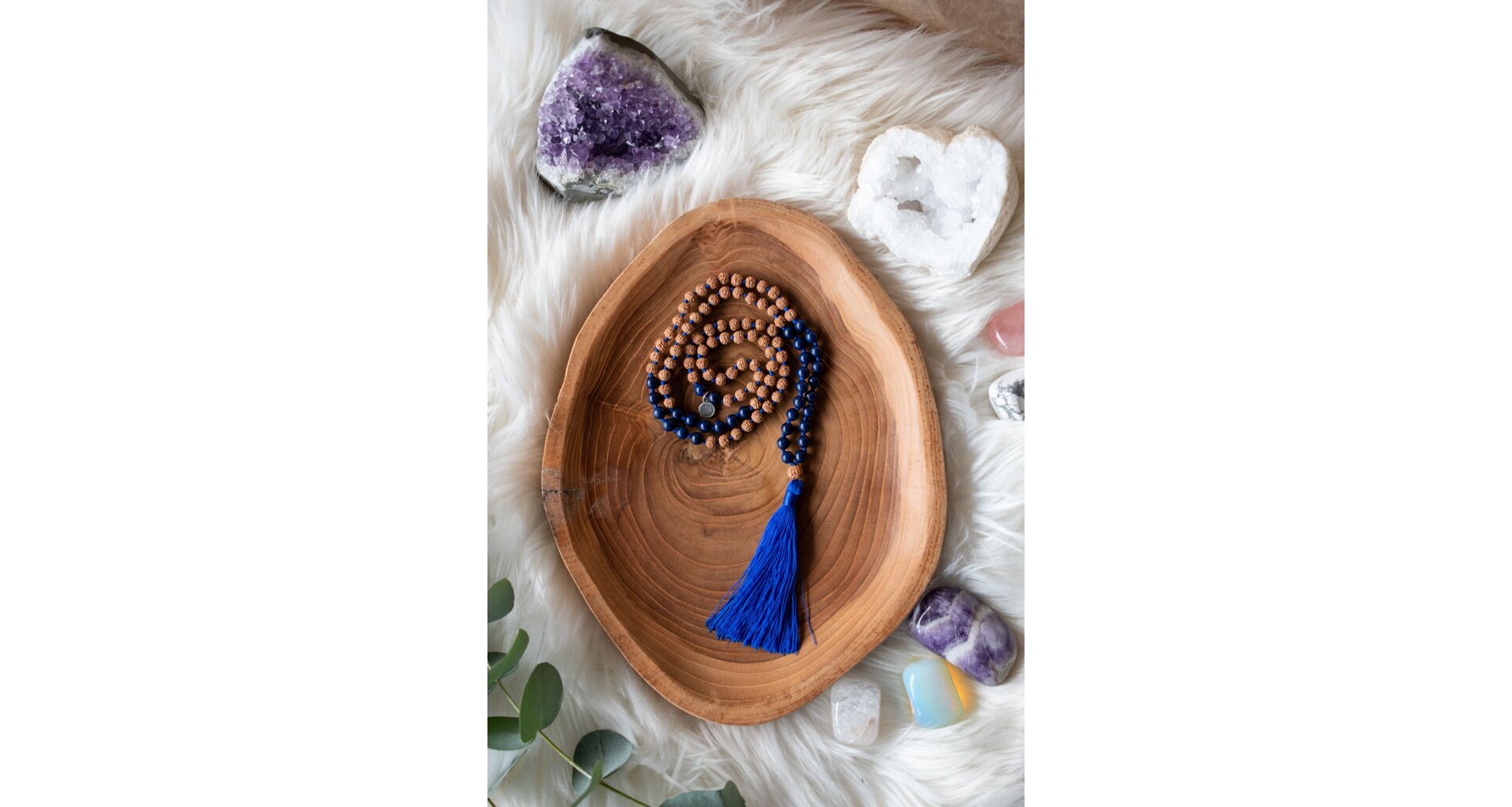 Lazurit a Rudraksha tvoří mocnou kombinaci pro duchovní prohloubení a ochranu. Lazurit je tmavě modrý kámen s bílými a zlatými žilkami, který podporuje moudrost, pravdu a vnitřní klid. Rudraksha, posvátné semínko, přináší duchovní sílu, ochranu a vyrovnanost. Společně pomáhají posilovat intuici, komunikaci a duchovní růst.