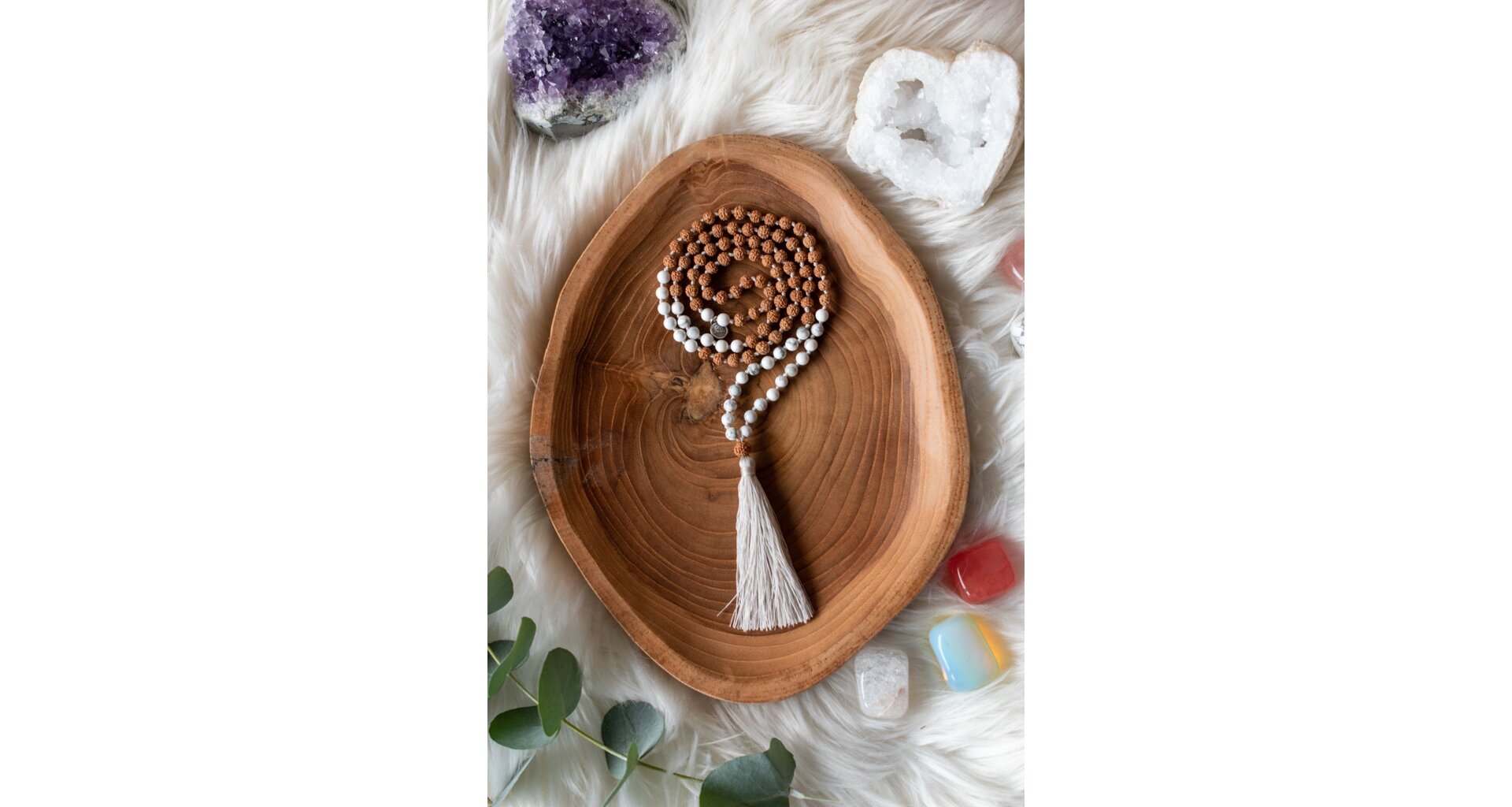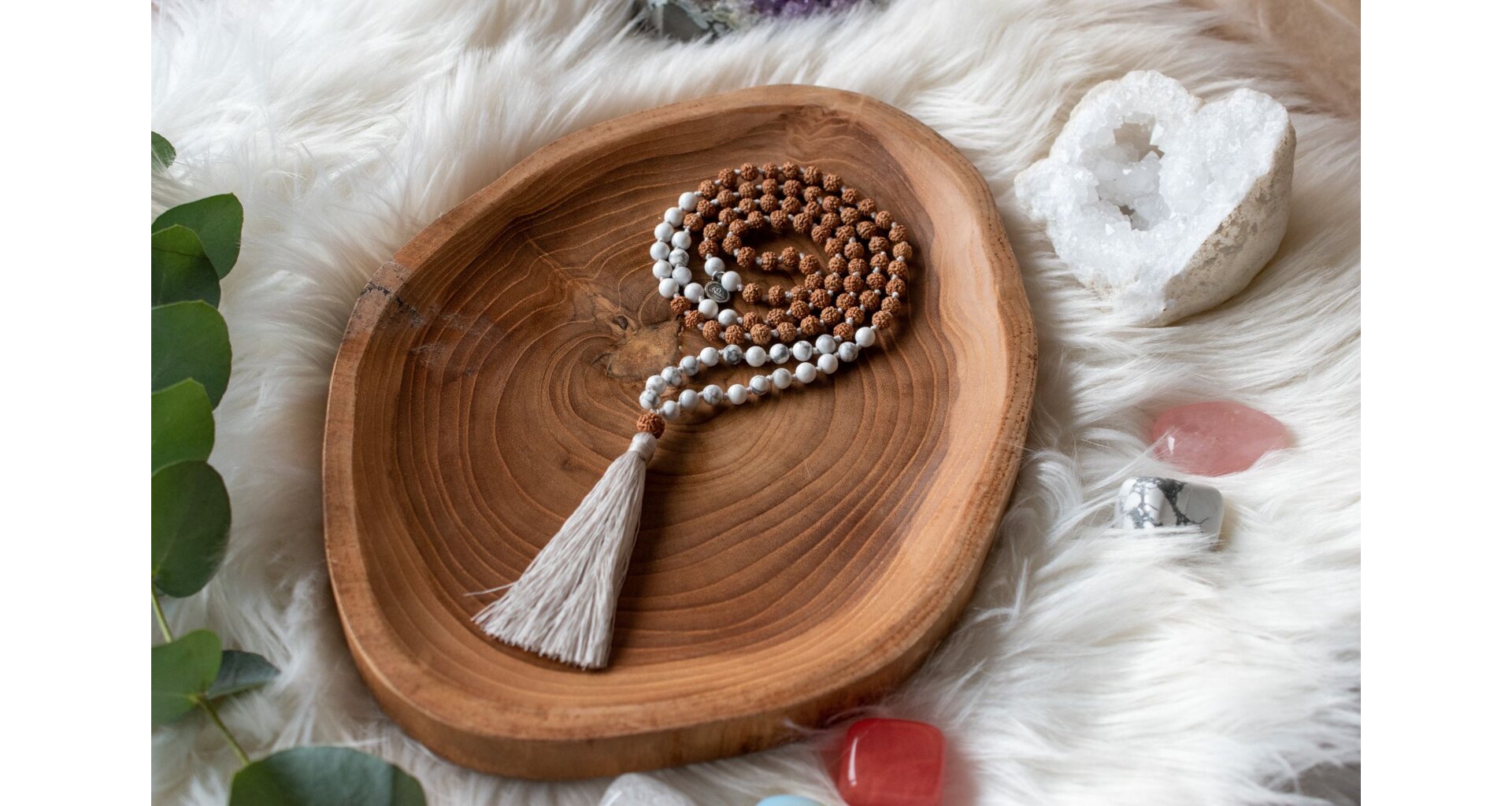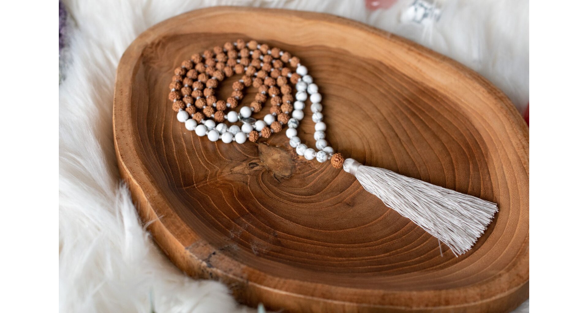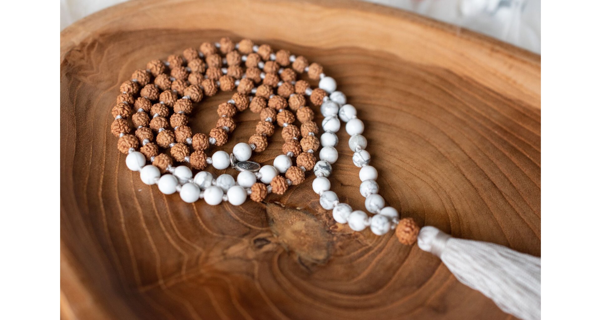 - Ručně vyrobená meditační mala s magnezitem a rudrakshou