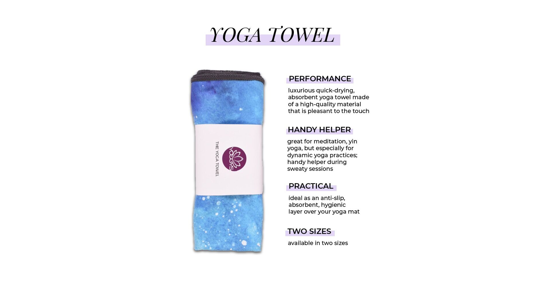 Krásný, luxusní, designový ručník, který má multifunkční využití. Můžeš ho použít jako extra protiskluzovou a absorbční vrstvu na Tvou jógamatku nebo jako klasický ručník, který je ale navíc rychleschnoucí a extra savý. Yoga towel ale udělá i velikou parádu na pláži či v létě u vody, kde budeš zaručeně originální. Je vyrobený z kvalitního, ultra jemného savého mikrovlákna z polyesteru a nylonu.